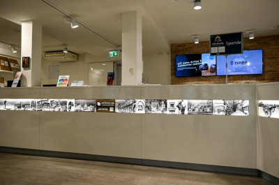 49 Schwarzweißaufnahmen, allesamt aus Esslingen, sind im Lichtband der Verkaufstheke integriert. Insgesamt 17 Mitglieder haben sich mit ihrem fotografischen Blick auf Esslinger Sehenswürdigkeiten beteiligt.